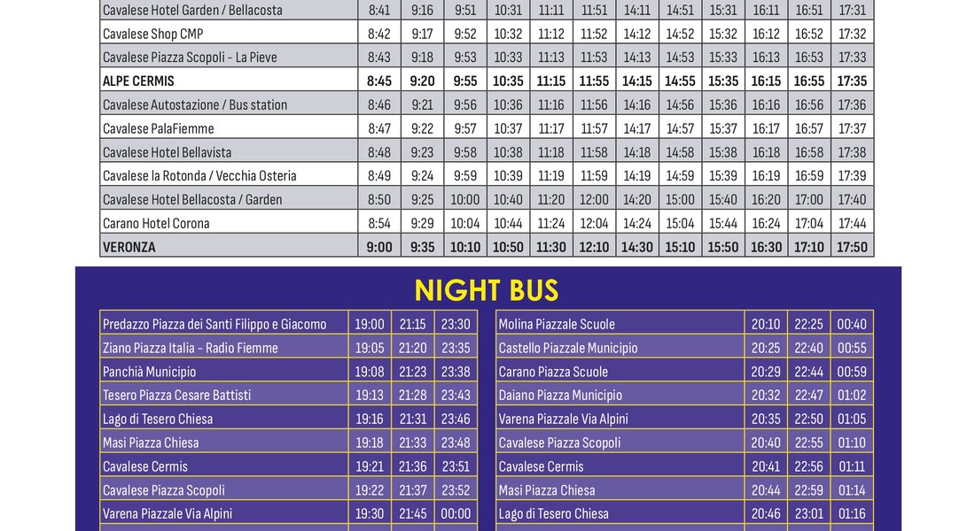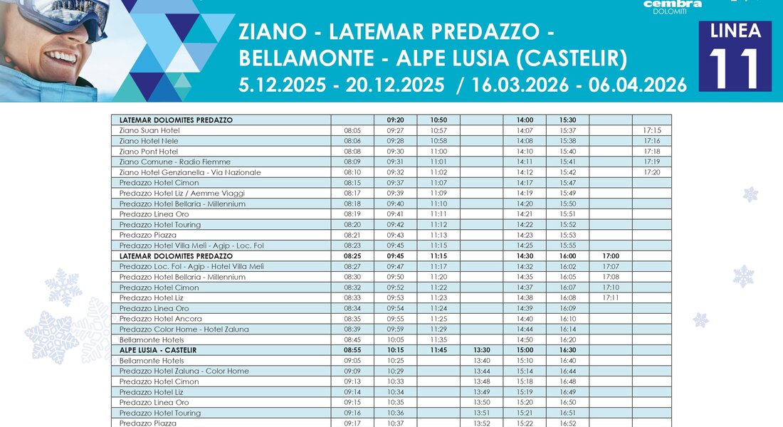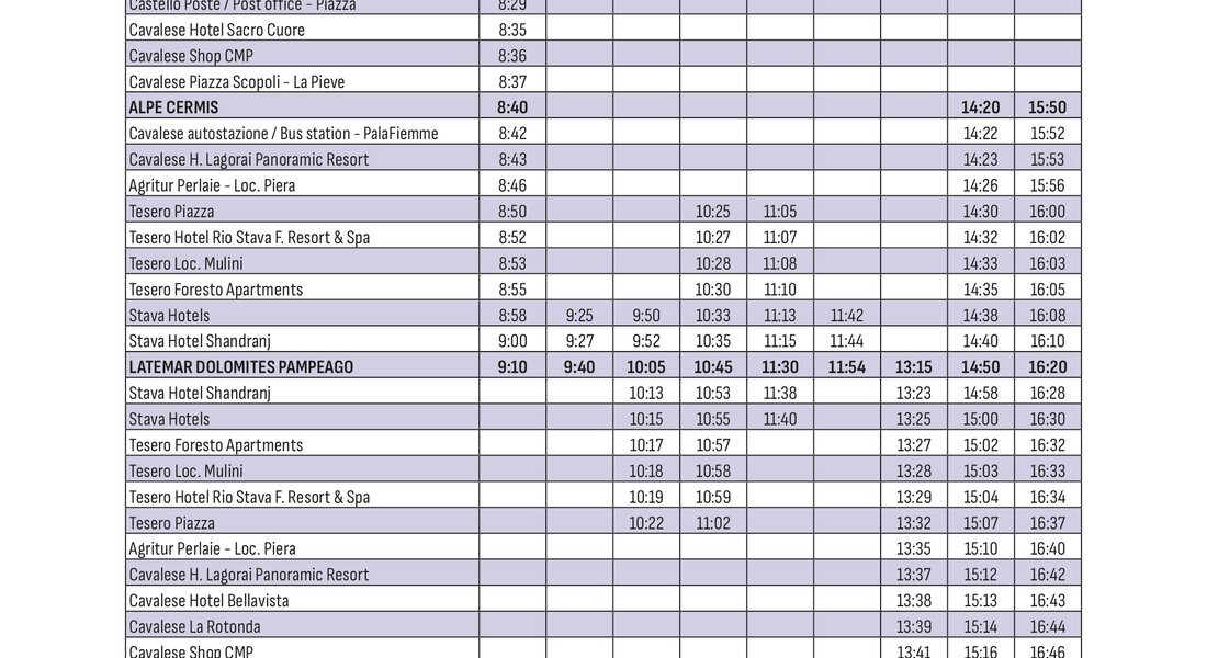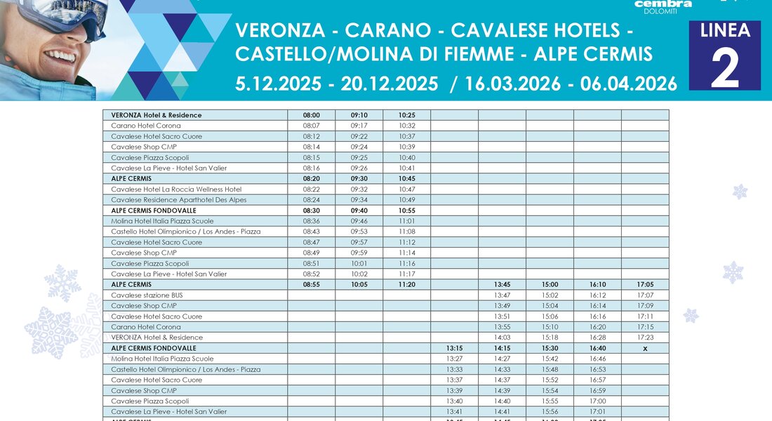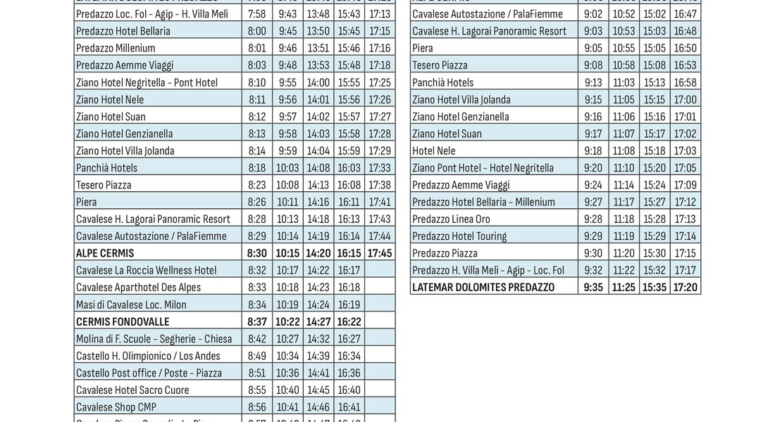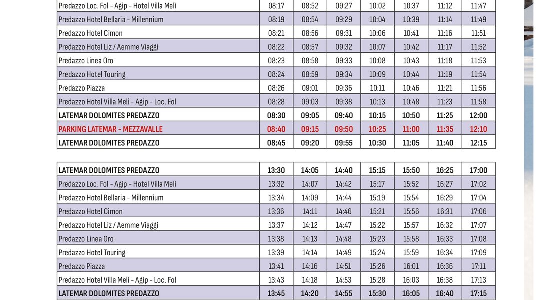 Raggiungi comodamente le piste da sci della Val di Fiemme senza lo stress di cercare un parcheggio e utilizza il servizio skibus che collega i paesi agli impianti sciistici durante tutta la stagione invernale.